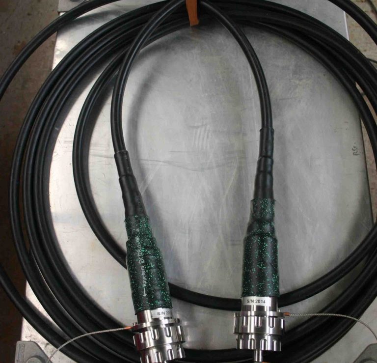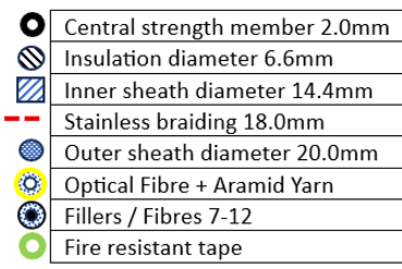 The fixed shore side cable running from the control room to the jetty mounted cable reel is typically 150m long but can be supplied longer if required. The cable is 6/12 way fibre optic with steel wire braid armoured. Both ends are pre-terminated with Straight Tip (ST) type fibre optic connectors for connection onto the control panel at the control room end and into the connector box on the jetty based fibre optic accumulator. The material used ensures that the cable pays out straight and does not retain a “memory” of its stored shape. It has been tested and proved to operate in a 3-hour fire test. In the event of problems with the fixed cable, the 2 spare cores 5 or 6 can be used in place of defective cores. For both cable types, each core has a graded index optic fibre core with silicon buffer, Kevlar strain relief and LSZH sheath. The overall cable is constructed with a central Fibre Reinforced Plastic strength member with an LSZH compound surround, fire resistant mica tape and flexible Galvanised Steel Wire Braid armour. A black polyurethane halogen free flame retardant sheath of 2.2mm thickness is used. Sheath is marked with cable type, manufacturer’s name and year of manufacture.